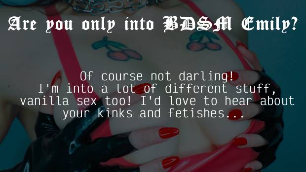 You can ASK FOR A DATE with Emily Doomed at your convenience. Everything is in your timezone, your local hours. She will receive your request and accept it if her schedule is free. You will receive a confirmation via email and you can prepare for your hot experience.